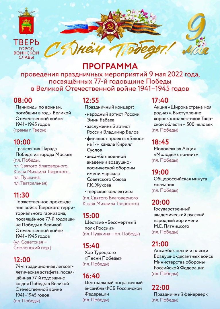 С 15.40 на площади Победы у Обелиска начнется праздничный концерт, посвященный Дню Победы. В 18.30 здесь состоится выступление сводного хора Тверской области. В 18.45 – акция «Молодежь помнит».