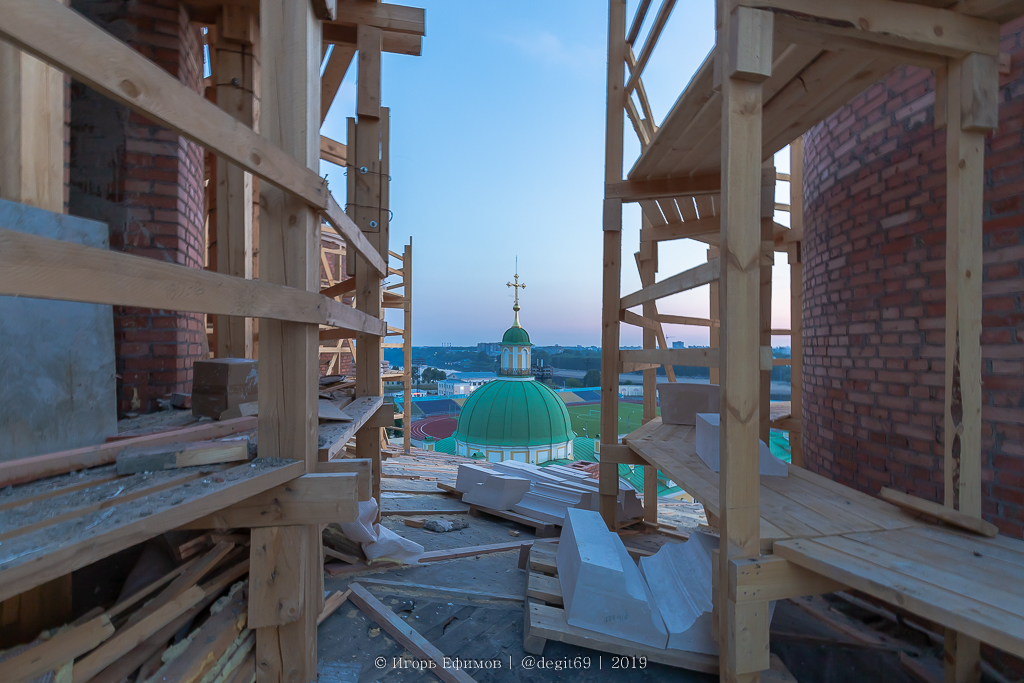 Игорь Ефимов: В 2014 году началось восстановление второго вида храма, так как лишь с него перед разрушением были собраны все мерки и остались чертежи. Однако облик первого храма не остался в прошлом. Во время первых археологических раскопок ученым удалось найти его фундамент, и с помощью цифровых технологий был воссоздан тот самый «Святой Спас Златоверхий». И вот в июле 2019 года купола Спасо-Преображенского собора вознесутся над древней Тверью. Таким образом, положено начало третьему уже собору на первоначальном его месте.