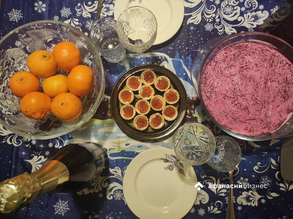 Праздничный новогодний стол отличался изобилием. В крестьянской среде праздник вписался в рождественскую структуру и перенял часть его семантики. Он наступал в момент окончания Рождественского поста, когда разрешается готовить мясные сытные блюда. В период «мясоеда» было принято вкусно и обильно есть, чтобы новый календарный год не выдался голодным. Обычно запекали целого поросенка, которого разламывали на куски и раздавали всем присутствующим. Запеченная свиная голова считалась особым лакомством. Также в числе ритуальных блюд были пироги, каша, орехи и сладости.Привычные для современности атрибуты Нового года закрепились в XX веке: оливье с докторской колбасой, селедка под шубой, шампанское, мандарины, вареная картошка с селедкой и луком — в СССР эти продукты стали символами доступного изобилия. В настоящее время помимо традиционных блюд на новогоднем столе присутствуют угощения, учитывающие восточный гороскоп и «вкусовые» предпочтения символа года. Традиция загадывать желание под бой курантов, как момент перехода из прошлого в будущее, стала массовой с 1970-х годов благодаря телевидению и новогодним огонькам. А речь главы государства перед боем часов стала одним из средств коммуникации между обществом и властью в XXI веке — при этом акцент как правило смещен на коммуникативную нежели информативную функцию, однако в последнее годы заметно усиление политического дискурса.