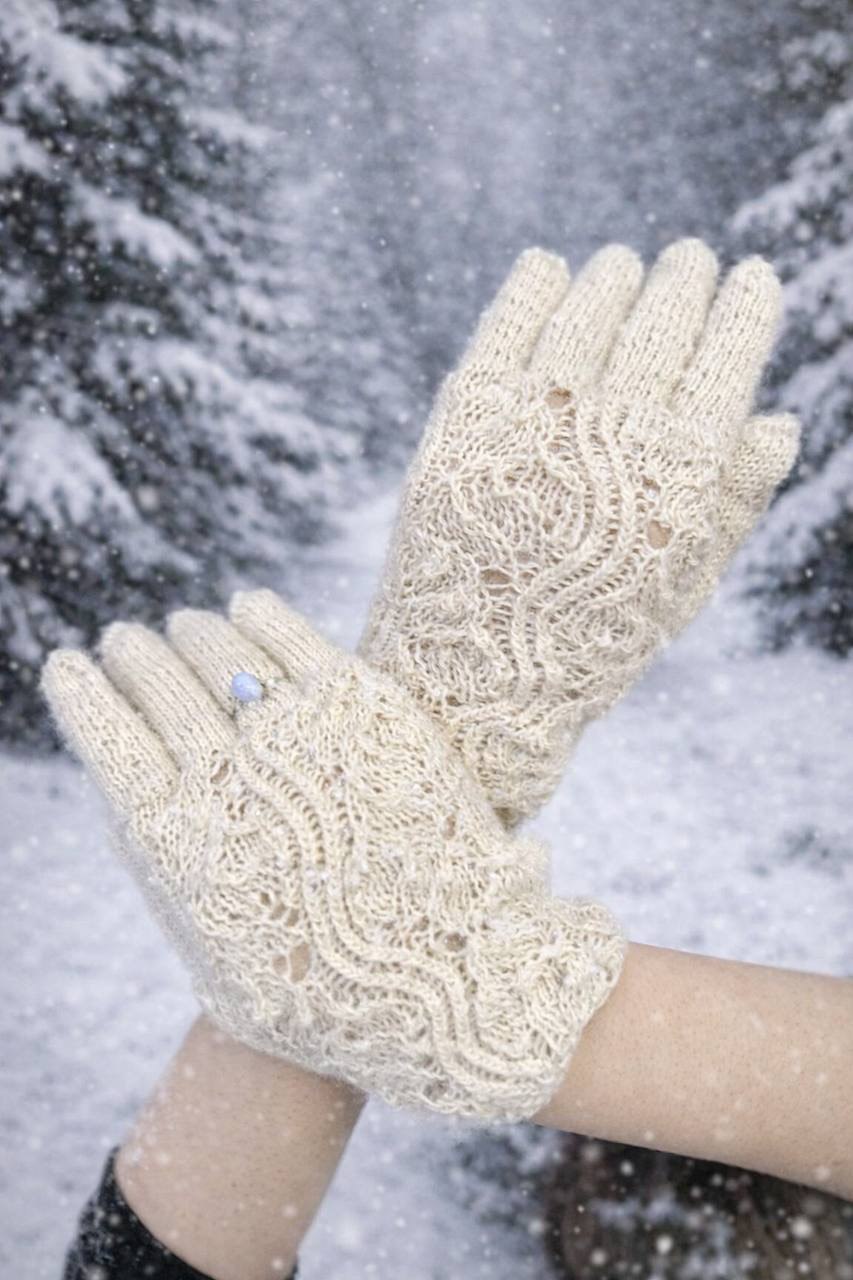 Особую нежность зимнему гардеробу в комплекте с пуховым платом придадут перчатки ажурной вязки из козьего пуха. Пух у козочек в Оренбурге уникальный, легкий, тонкий, при этом отличается особой прочностью и сохраняет тепло.