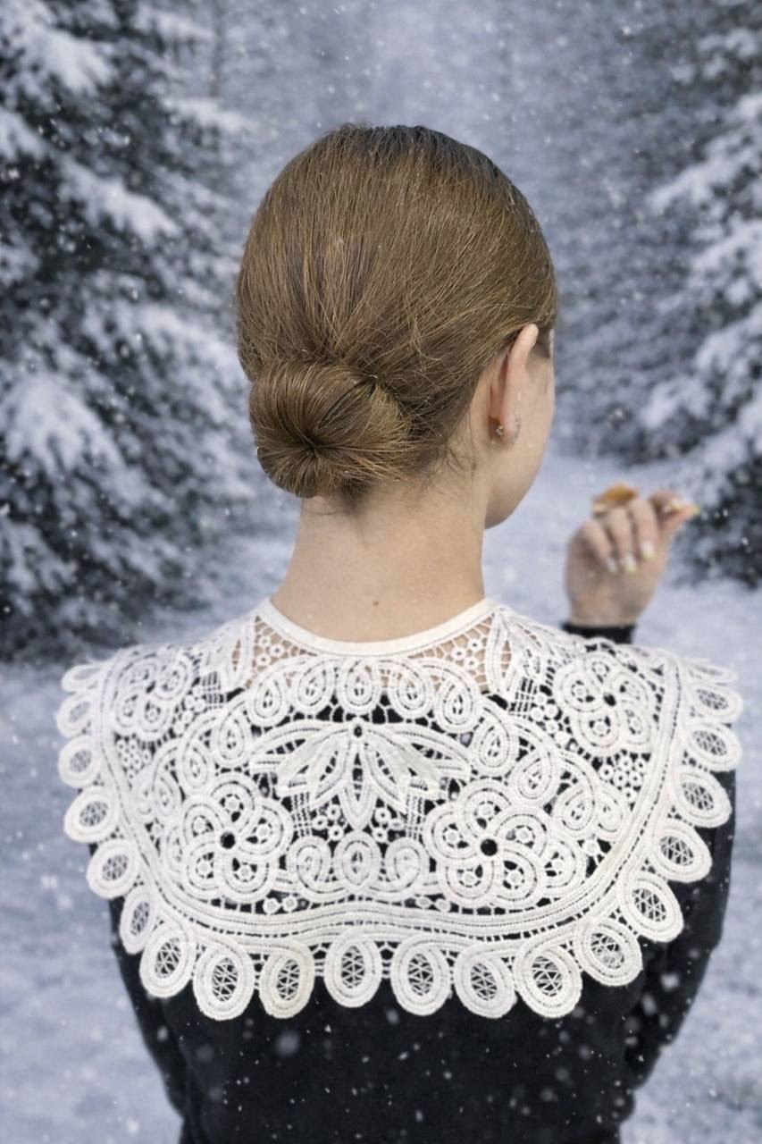 Кружево можно назвать ключевым трендом сезона. Топ, выглядывающий из-под джемпера, кружевная юбка, но особенно — кружевной воротничок. Этот романтичный аксессуар способен преобразить даже самый скромный образ, привнеся в него аристократичный шик. Беспроигрышный прием — сочетание черной базы и белого воротничка, придающее образу строгость и величие.