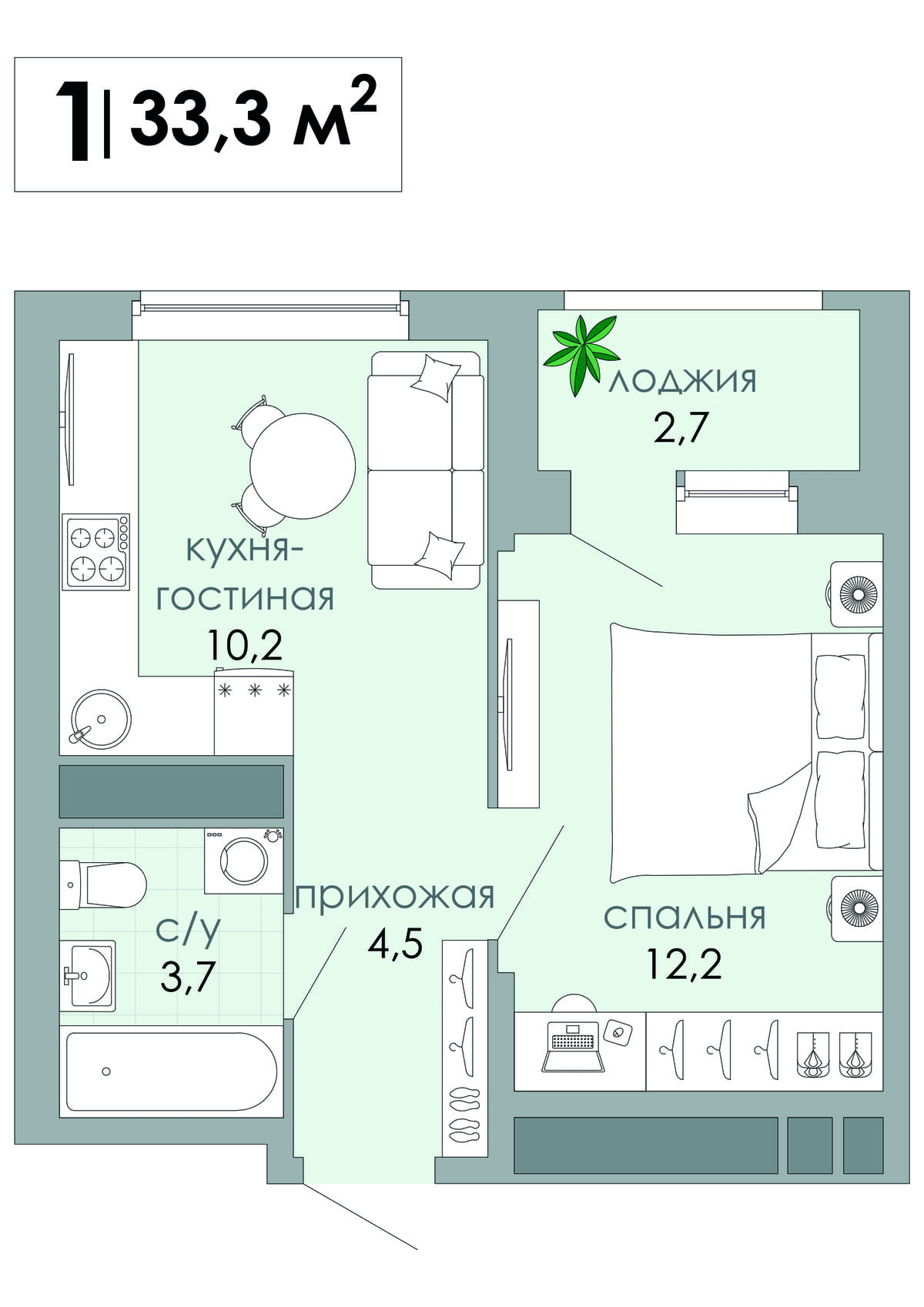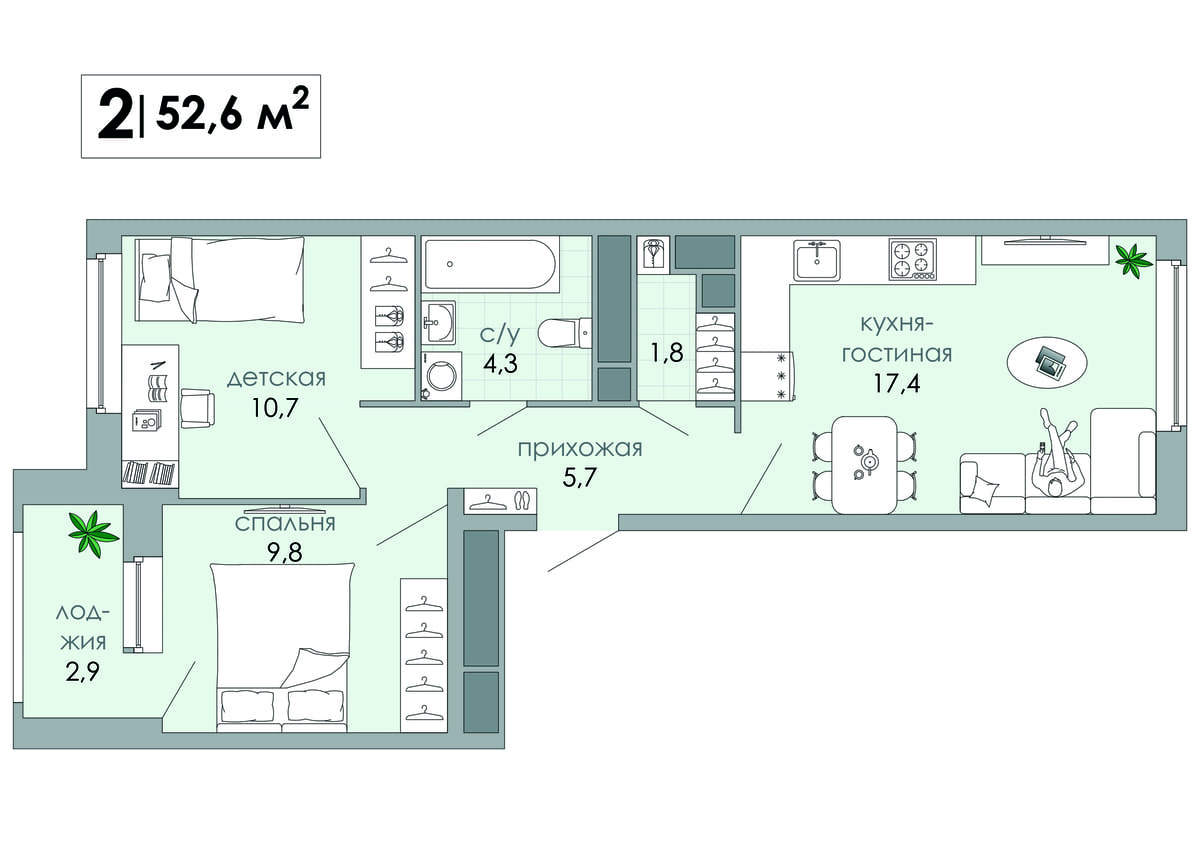 А просторная 2-комнатная квартира “на вырост” площадью 52,6 м2 с отдельной гардеробной и большой кухней-гостиной обойдется всего в 26 779 руб/мес.