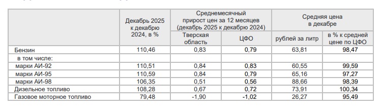 По ценам на газовое моторное топливо Тверская область в декабре занимала 15 место.
