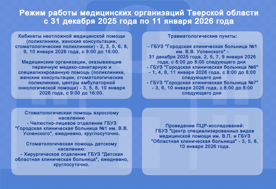 Медицинские организации, оказывающие первичную медико-санитарную и специализированную помощь (поликлиники, женские консультации, стоматологические поликлиники, центры амбулаторной онкологической помощи) откроются для посещения 3, 5, 8, 10 января 2026 года — с 9:00 до 16:00.