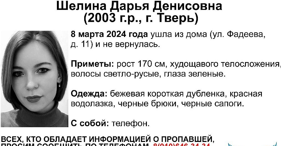 В последний раз ее видели родственники 8 марта 2024 года, когда она ушла из дома по адресу Тверь, улица Фадеева, 11.