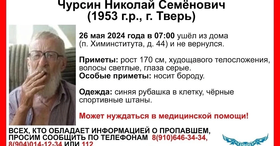 26 мая 2024 года в Твери в поселке Химинститута ранним утром ушел из дома и не вернулся Николай Семенович Чурсин.