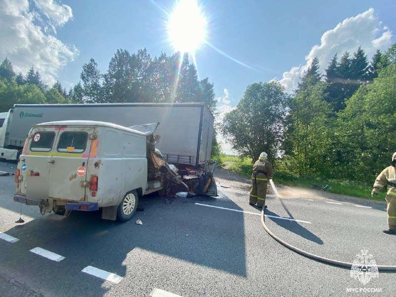 9 июня спасатели ликвидируют последствия дорожно-транспортного происшествия на трассе у поселка Хабоцкое в Краснохолмском округе. Там столкнулись фургон и грузовой автомобиль.