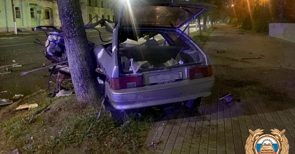 Здесь, как уточнили в ГАИ, ВАЗ 2114 вылетел с дороги и врезался в опору рекламной конструкции. На рамке номера автомобиля написано: «Учился ездить в GTA».