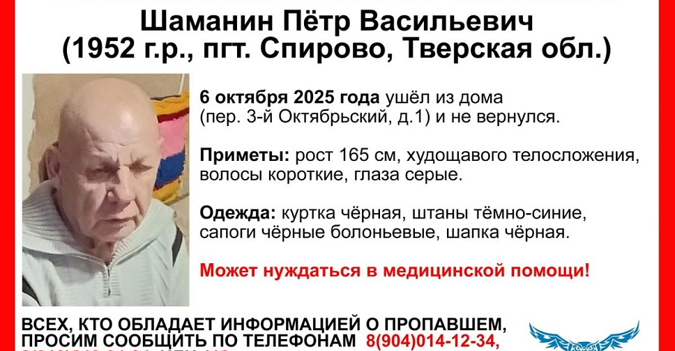 Местонахождение мужчины неизвестно с 6 октября 2025 года. Отмечается, что пропавший может нуждаться в медицинской помощи.