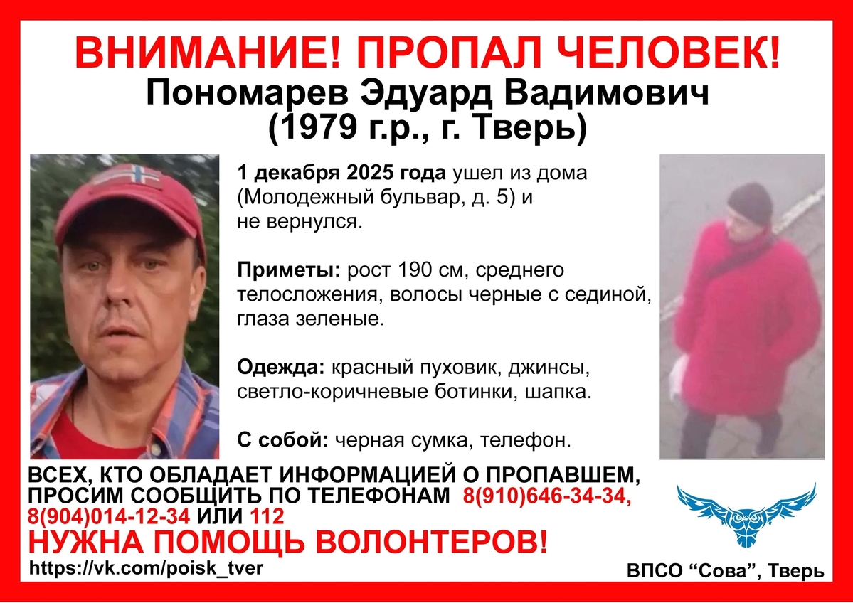 Информацию о местонахождении тверитянина просят сообщать по указанным в ориентировке номерам волонтеров или инфоргу поиска: 89040037787 (Анастасия Пальма).