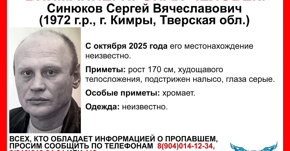 Волонтеры поисково-спасательного отряда «Сова» сообщили о пропаже в Кимрах мужчины 1972 года рождения.