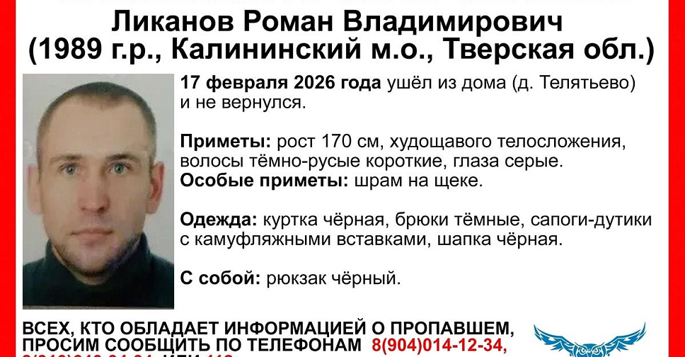17 февраля мужчина 1989 года рождения ушел из дома в деревне Телятьево и не вернулся.