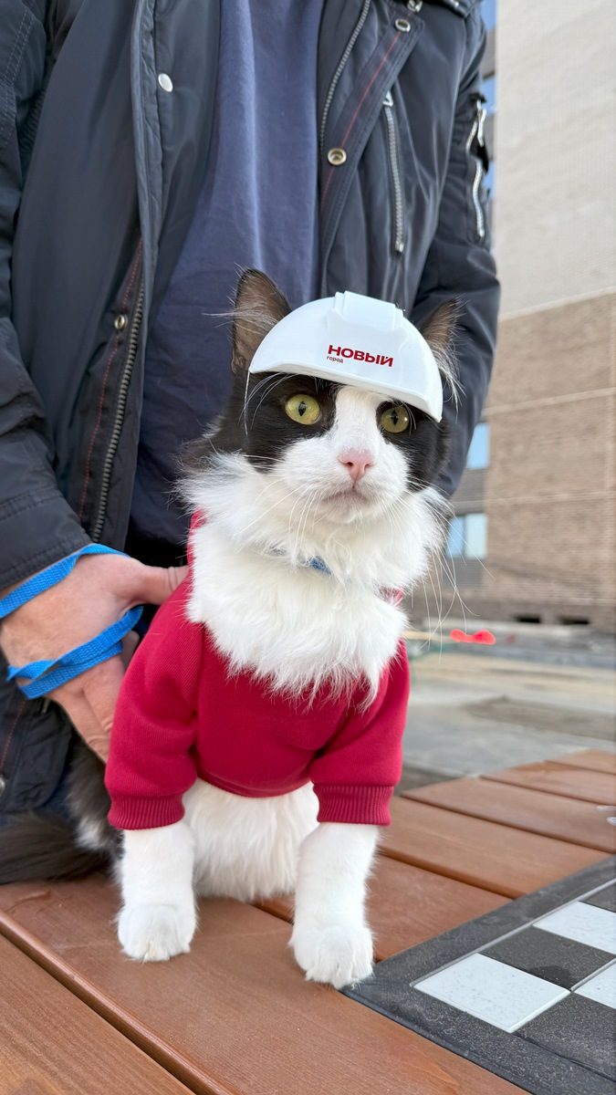 История кота началась ещё летом — на стройке девелопера «Новый город» обнаружили чёрно-белого красавца. Бездомный пушистый, видимо, решил, что надо брать судьбу в свои лапы и строить себе дом самостоятельно.