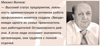 В числе тех, кто всю свою трудовую жизнь посвятил заводу, Анатолий Шубенкин, Владимир Целищев, Али Мамедов, Владимир Власов и другие. Общий трудовой стаж этих людей составляет почти 200 лет. Каждый из них внес в развитие своего второго дома, как они называют завод, что-то свое, создал какой-то уникальный проект. Наверное, благодаря самоотверженности и трудолюбию признанных корифеев своего дела «Звезда» смогла пережить обвал российской ракетно-космической отрасли и серьезный спад в 90-е годы, когда промышленность страны из-за недостаточного финансирования оказалась в сложнейших условиях. Конечно, добиваться успехов в течение стольких лет удается и благодаря грамотному руководству, но сам директор завода Михаил Волков считает, что залог стабильности «Звезды» связан прежде всего с профессионализмом сотрудников предприятия, многие из которых даже в самые тяжелые времена не предали «Звезду» и не ушли работать в другие организации. А последнего финансового кризиса «Звезда» вообще практически не почувствовала. Когда большинство заводов Тверской области и всей России простаивали, предприятие на острове Городомля не просто работало с полной загрузкой, но даже увеличило объемы выпускаемой продукции. Сегодня и руководство завода, и все его сотрудники с уверенностью смотрят в завтрашний день, ведь предприятие обеспечено заказами вплоть до 2020 года. Более того, если в прошлом году в реконструкцию и техперевооружение завода было вложено более 80 млн рублей, то в 2011 году эта сумма значительно увеличена.