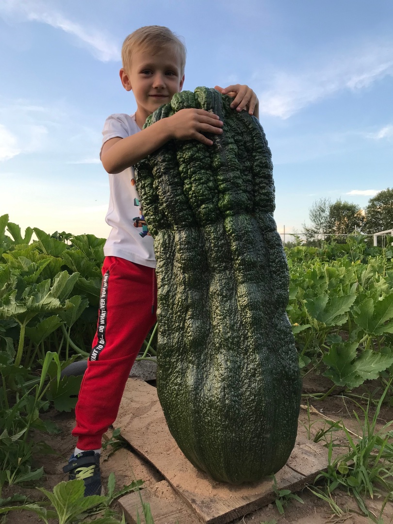 «В прошлом году у нас было 4 растения на которых выросло 5 тыкв. Самые крупные плоды весили более 400кг. За четырьмя гигантиками сложно полноценно ухаживать, и я говорила, что никогда и ни за что столько много сажать больше не буду. В этом сезоне у нас растёт 5 разноцветных тыквин. Белая, две оранжевых и эксклюзив и писк тыквенной моды - две зелёных тыквы разных оттенков!».