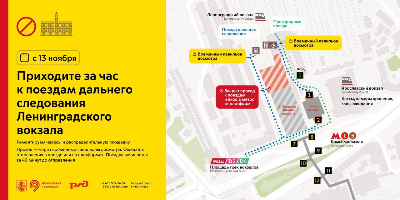 Для прохода к поездам дальнего следования: со стороны проезда Комсомольской площади маршрут не изменится. Временный досмотровый павильон будет расположен чуть дальше привычного выхода на платформы; со стороны Ярославского вокзала и вестибюля станции метро «Комсомольская» проход к поездам будет расположен рядом с платформами пригородных поездов. Этот подход доступен для маломобильных пассажиров и оснащен пандусом.