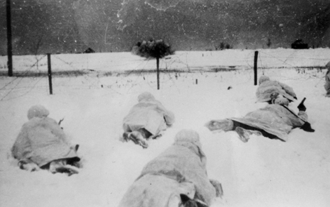 Пехота залегла у проволочного заграждения, декабрь 1943 г. Место съемки: Калининский фронт. Автор съемки: Борис Евгеньевич Вдовенко