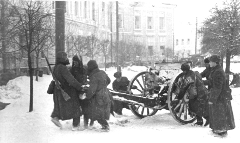 Артиллеристы, вступившие в освобожденный город, занимают огневые позиции, 17 декабря 1941 года. Место съемки: Калинин. Автор съемки: Борис Евгеньевич Вдовенко