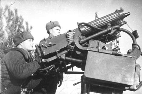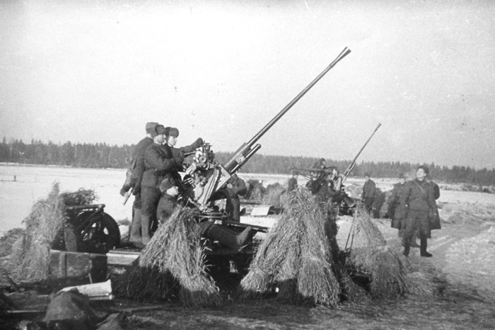 Зенитчики прикрывают войска 31-й армии от налета вражеских бомбардировщиков, декабрь 1941 г. Место съемки: Калининский фронт. Автор съемки: Борис Евгеньевич Вдовенко
