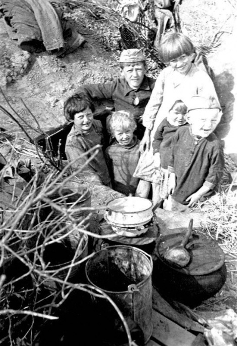 Дети колхозников одной из деревень Калининской области в лесу у землянки, где они жили в дни оккупации, 1942 г. Место съем-ки: Калининская область. Автор съемки: Д. Чернов