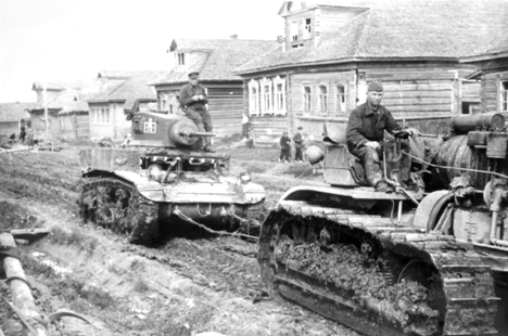Через деревню Синицино везут трофейный танк, 5 июля 1942 г. Место съемки: Калининский фронт. Автор съемки: Борис Евгеньевич Вдовенко
