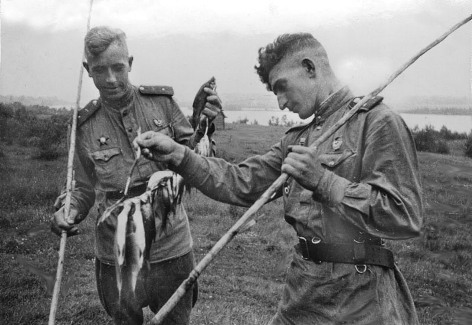 Рыболовы-любители младший лейтенант В. Тарелкин, лейтенант Г. Инсаридзе — летчики 6-го гвардейского штурмового авиационного полка, 1943 г. Место съемки: Калининский фронт. Автор съемки: Борис Евгеньевич Вдовенко