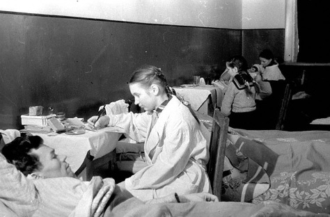 Учащиеся школы №6 г. Калинина пишут письма домой под диктовку раненых бойцов, находящихся на излечении в госпитале, 1943 г. Место съемки: Калинин. Автор съемки: не установлен