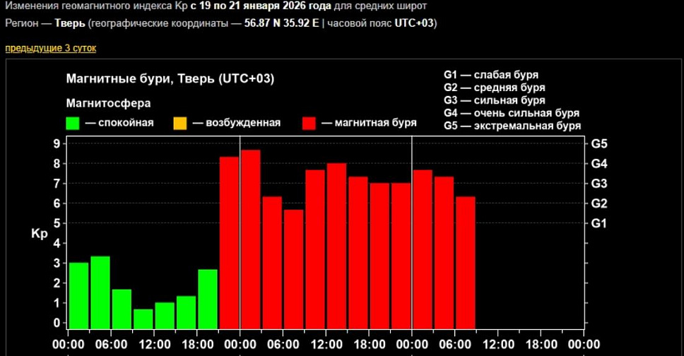 Новости Твери, 21 января. — Планетарный индекс Kp держится немногим выше уровня G2.